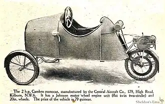 The Cambro was a very basic British three-wheeled, single-seat cyclecar made in 1920 and 1921 by the Central Aircraft Company of Northolt, Middlesex.