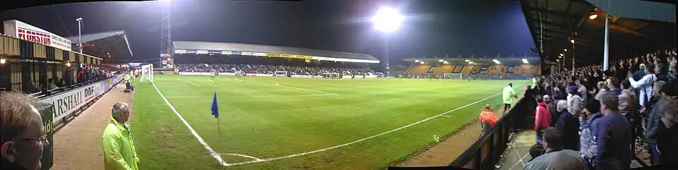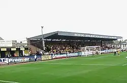 - The South Stand – a single-tier, all-seater stand, opened in 2002. This stand was primarily built to house away fans however it is often used to seat home supporters at ticket promotion matches. At the same time that the South Stand was constructed a new police control centre was built to the west of the stand. This building also houses emergency medical facilities for players and spectators. Through a sponsorship deal it is currently named the Mead Plant & Grab Stand, and has previously been named the Marston's Smooth Stand [13] and the Heritage Conservatories Stand through similar commercial arrangements.