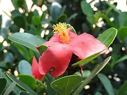 Camellia azalea, native to the Ehuangzhang Provincial Nature Reserve in Yangchun City, Guangdong, China, is a national first-class protected plant in China.[3] The Chinese name of Camellia azalea is 杜鹃叶山茶/Rhododendron leaf camellia (dù juān yè shān chá),[4] because of its rhododendron-like leaf shape. Compared with other camellia species, the flower of Camellia azalea is more like Rhododendron, so it is commonly known as 杜鹃红山茶/Rhododendron red camellia.[5] It is also commonly known as 四季紅山茶/Four Seasons Red Camellia or 四季茶花/Four Seasons Camellia, because it can flower throughout the year, July-September is the most prosperous period of flowering, which is different from the habit of Camellia flowering in winter.[6]