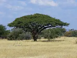 Vachellia erioloba, the camel thorn, also known as the giraffe thorn, mokala tree, or Kameeldoring in Afrikaans, still more commonly known as Acacia erioloba, is a tree of southern Africa in the family Fabaceae.[3] Its preferred habitat is the deep dry sandy soils in parts of South Africa, Botswana, the western areas of Zimbabwe and Namibia. It is also native to Angola, south-west Mozambique, Zambia and Eswatini.[4] The tree was first described by Ernst Heinrich Friedrich Meyer and Johann Franz Drège in 1836.[4] The camel thorn is a protected tree in South Africa.[5]