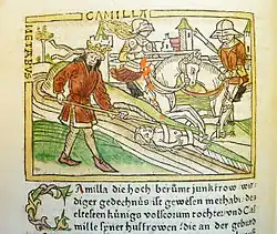 In Virgil's Aeneid, Camilla of the Volsci is a warrior who fights against the Trojans during the war in Latium. She stars in Book 11, where she leads a battle against the Trojans and is eventually killed. Camilla is the daughter of King Metabus and Queen Casmilla.[1]