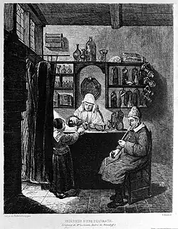 Apothecary shops are a place that is able to provide medications and remedies to diseases. These medications are typically made from "compounds and tonics".[10] These products were formed from "ingredients such as rosewater, lavender, oatmeal, lemons, almonds, elderflower, water and even sugar".[10] This practice is now equivalent to modern day physicians and pharmaceutical companies.