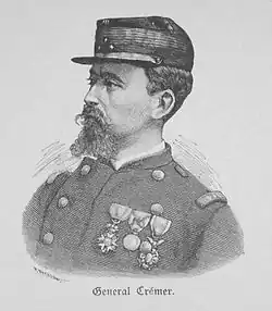 During the Franco-Prussian War, he took part in the fighting around Metz. But he was captured around late October and taken prisoner in Metz, he was taken to an internment camp in Germany from where he escaped for his word of honor to not continue serving against Germany and so, he returned to France via the Palatinate, Grand Duchy of Baden and Switzerland.[1] He joined Gambetta who appointed him brigadier general. He became head of the 3rd Infantry Division 24th Army Corps. In December 1870, General Crémer fought in Bligny-sur-Ouche, then in Nuits-Saint-Georges, near Dijon. He took an active part in the battles of the Army of the East, but did not go to Switzerland during his retirement, preferring, like Rear Admiral Penhoat and General Billot, to join Lyon via the Highlands. from the Jura in early February 1871.