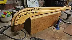 Equipment included a stick (Manx: camman, meaning "little curved thing"[2]) and a ball (crick or crig) with anything up to 200 players. Sometimes whole towns and villages took part, or even played each other. The camman was similar in design to the caman in shinty, both having no blade unlike the Irish camán. A gorse wood camman, if of suitable size and shape, was a very much treasured possession. The crick can be made from cork or wood, and varied from circular to egg-shaped, sized from approximately two inches in circumference to 'the size of a fist'. Old accounts tell that the crick was sometimes covered in cloth or leather.[3]