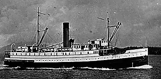 When Prince Rupert was founded, in 1906, Camosun was the first passenger ship to call at the new port.[1] The harbor at Prince Rupert had not been fully surveyed, and in July 1906, Camosun struck a rock in the harbor.[1] The vessel would have sunk, but was saved by the double-bottom design.[1] As a result, service was disrupted by the need transfer Camosun to Victoria, British Columbia, where the vessel underwent repairs at Joseph Spratt's shipyard.[1]