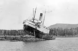 On March 7, 1916, at 2:00 am, while en route to Masset, Camosun under the command of Capt. A.E. Dickson, was moving at one-quarter speed through a heavy snow storm.[11] The ship went aground near Prince Rupert harbor, at Digby Island.[11] At low tide the vessel was completely clear of the water. The seventeen passengers on board were removed by rescue vessels which had come from Prince Rupert.[11] To lighten the ship to allow it to float free at high tide, cargo bound for the Queen Charlotte Islands, including 100 tons of coal, was off-loaded into smaller transshipment vessels.[11] Camosun's strongly built hull allowed the ship to remain on the rock without damage until March 17, when the ship was finally got off under its own power.[11] The damage from the grounding turned out to be minor.[11]