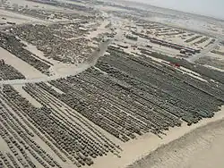 ![]() Thousands of tires and other military equipment line a staging area at Camp Arifjan, 2004 | |||||||||