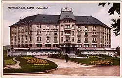 The place selected for the camp was the Palace Hotel, a four-story luxury hotel dominating the small spa town, which had earlier in 1945 been used as a billet for U.S. troops.[1] The hotel was transformed into a high-security area with a 15-foot (4.6 m) high electrified barbed wire fence, guard towers with machine guns and klieg lights.[4] Security was so tight that even the MPs guarding the perimeter knew not what went on inside; they quipped that getting in required "a pass signed by God, and then somebody has to verify the signature".[2] Conditions in the prison were spartan. The hotel furniture was replaced by Army cots and collapsible tables.[3]