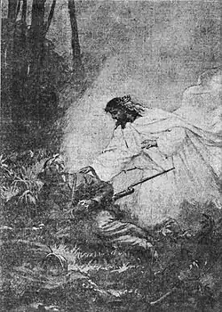 That same year (1915), a painting of Christ appearing to a dying soldier was commissioned by the church, and C. Day Rudy, a Civil War orphan, was chosen to create the allegorical work, which was dedicated on Memorial Day weekend that year (May 30, 1916). Rudy also then later crafted the stained glass Rose Window which has been preserved in the church's present-day sanctuary.[6] In June, congregants petitioned the Pennsylvania Legislature to erect a monument near the church memorializing the site of the church as the site of the historic Civil War-era training camp mentioned above. The petition read:[8]