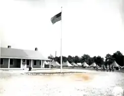 ![]() Headquarters and Tent Area at Camp Curtis Guild, Boston Port of Embarkation. Note Transportation Corps emblem on building. | |