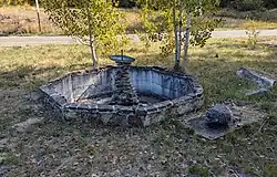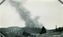 In the first week of June, men from Camp Growden were called to help control a fire burning along Trout Creek 10 mi (16 km) north of Republic. The fire started June 3 in a dry area along the creek and was rapidly spread by strong gusty winds.[46] By Saturday June 5 the fire had been contained within a fire line by 40 men from Camp Growden & Republic. The 40 acres (16 ha) fire was expected to burn itself out within the fire lines unless heavy wind gusts caused a jump of the fire lines.[47] Over the next two months Growden men focused on the land clearing for the installation of telephone lines running between Tonasket and Kettle Falls with spur lines to each of the fire lookouts in the Kettles and Highlands. By July 30 a total of 600 mi (970 km) of telephone wire had been installed connecting the fire lookouts and the four radio broadcasting stations of the region.[48] July 29 also saw the arrival of 15 new enrollees from Arkansas to replace men that had departed since the March unit swaps.[48] Over the course of the year the enrollees finished the initial dam on Sherman Creek at 25 ft (7.6 m) tall by 150 ft (46 m) across the valley floor and topped with a 16 ft (4.9 m) wide access road. The filling of Sherman Lake was started.[3] The company also completed 5 mi (8.0 km) of forest road along with maintaining and building trail, stock driveways, and bridges.[41]
