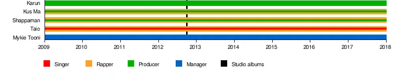 After releasing a series of experimental projects, manager Mykie Tooni and rappers Shappaman (then known as Young Kass) and Taio (then known as Taio Tripper) co-founded the group in mid-2009, with Karun (then Miss Karun) and Kus Ma (then K'Cous) joining later. Initially distributing their music online via ReverbNation, SoundCloud and SoundClick for digital download, their song "Low" was the first to gain radio airplay, having been introduced by radio presenter Eve D'Souza on Capital FM when it debuted on radio in 2009.[4]