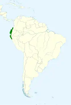 The Guayaquil woodpecker is found from southwestern Colombia's Cauca Department south through Ecuador west of the Andes into northwestern Peru's Department of Cajamarca. It inhabits the interior and edges of dry to humid deciduous forest and also mature secondary forest. In elevation it ranges as high as 1,100 m (3,600 ft) in Colombia and 1,500 m (4,900 ft) in Ecuador and Peru, but there mostly below 800 m (2,600 ft).[4]