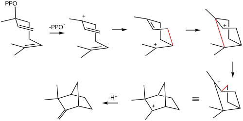 Camphene is biosynthesized from linalyl pyrophosphate via a sequence of carbocationic intermediates.[5]