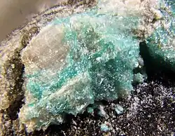 Campigliaite is a copper and manganese sulfate mineral with a chemical formula of Cu4Mn(SO4)2(OH)6·4H2O.[3] It has a chemical formula and also a crystal structure similar to niedermayrite, with Cd(II) cation replacing by Mn(II).[6] The formation of campigliaite is related to the oxidation of sulfide minerals to form sulfate solutions with ilvaite associated with the presence of manganese. Campigliaite is a rare secondary mineral formed when metallic sulfide skarn deposits are oxidized.[3] While there are several related associations, there is no abundant source for this mineral due to its rare process of formation. Based on its crystallographic data and chemical formula, campigliaite is placed in the devillite group and considered the manganese analogue of devillite.[7] Campigliaite belongs to the copper oxysalt minerals as well followed by the subgroup M=M-T sheets.[8] The infinite sheet structures that campigliaite has are characterized by strongly bonded polyhedral sheets, which are linked in the third dimension by weaker hydrogen bonds.[8]