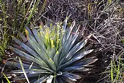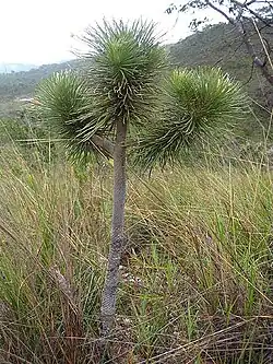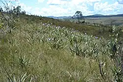 The campo rupestre ecoregion consists of a distinct set of habitats where open vegetation prevails and is subject to harsh climatic and pedological conditions. Rocky outcrops, grasslands and shrublands account for the most common habitats and are dominated by lineages such as Velloziaceae, Cyperaceae, Poaceae and Eriocaulaceae.[10] Although few plant families predominate in this ecoregion, species richness is high; the Espinhaço Range alone accounts for seven percent of the Brazilian flora, while all the mountain ranges comprising the entirety of campo rupestre harbor approximately 15% of Brazil's plant diversity.[3][11] The relatively high levels of diversity in the campo rupestre can be explained by the environmental requirements unique to each habitat (or micro-habitat), which vary according to a wide range in latitude and elevation.[12] Insularity can also foster diversity in the campos rupestres; given its discontinuous distribution across several mountain ranges overcoming long-distance dispersal can pose a challenge to many lineages.[13]