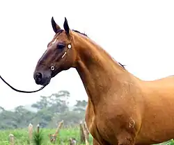 The head of the Campolina is described as trapezoidal in shape,[5] but the silhouette of this horse is smoothly rounded.[7] Between the ears, the poll is to be visible and raised by a few centimeters above the temples. The forehead is to be flat,[4] and the nasal bones apparent near the midpoint of the face in the rostro caudal plane. The head in profile is convex.[5] Campolinas are not, however, described to have a true Roman nose, as the convex profile begins approximately two finger widths below the base of the orbit. The muzzle should be soft and rounded, usually dark in colour, as are the hairs of the inner ear, mane and tail relative to the coat over the body. The nostrils are equal in size and should have a fine layer of flesh around the dorsal surface allowing for approximately one centimeter of separation between the thumb and pointer of the evaluator when the thumb is inserted into the nostril at a depth of around one inch. The outer edge of the nostril should be slightly thicker. The lips should be full and taut about the teeth. The ears are evenly placed when viewed from the front of the horse and not extend vertically more than three times the width of the eye when measured across the inner pinnae. The pinnae should close to a clean tip at the top of each ear. Eyes should be expressive.[7]