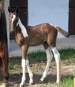 The resulting foal from the breeding was a gray colt named "Monarca", who lived until 1898 and served for 25 years in Campolina's herd; he is considered the foundation stallion of the Campolina breed.[2] Other breeds that Campolina used in his herd were Anglo-Norman, Clydesdale, Holsteiner, and American Saddle Horse. Bloodlines from the Mangalarga Marchador, were also added to refine the Campolina. The herdbook was closed in 1934 and the breed standard was first defined.[3] In 1938, the Professional Consortium of Campolina Horse Breeders was formed to formally organize the breed, and in 1951 the organization was renamed to the Campolina Breeders Association, the breed standards were formally adopted, with the organization based in Belo Horizonte.[4] There were further updates to the breed standard in 1975[3] and 1993. There are currently around 85,000 registered Campolina horses, with slightly over 7,300 registered breeders. Around 4,300 mares were bred in 2003.[5]