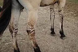 Dun-colored Campolinas generally display pronounced primitive markings including dorsal stripe, pale guard hairs on either side of the mane, transverse shoulder strip, and leg striping, called "zippers" by Campolina breeders.