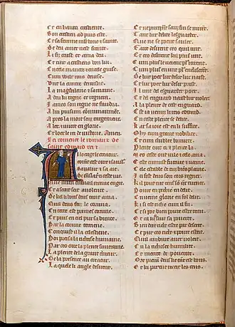 There are various evidences that, in this aristocratic house, the language of use was Anglo-Norman. An important book inscribed Cest livere est a covent de Campisse is a large volume of Saints' Lives in Anglo-Norman verse (known as the "Campsey Manuscript", now in the British Library). This was used for mealtime readings in the Campsey refectory.[44] The main part of the book contains Lives of Thomas Becket (by Guernes de Pont-Sainte-Maxence), Edward the Confessor, Archbishop Edmund Rich, St Etheldreda,[45] St Osyth, St Faith, St Modwenna, Richard de Wych and the Life of St Catherine by Clemence of Barking. Appended to this are Lives of St Elizabeth of Hungary, St Paphnutius and St Paul the Hermit, attributed to Nicholas Bozon. This stimulating collection, with several items of East Anglian and feminine interest, was compiled between 1275 and 1325, and is beautifully written.[46][47] A Latin Psalter which belonged to the priory, apparently produced c. 1247–1249, with superbly foliated initial letters, includes Calendar references to the East Anglian saints Seaxburga, Wihtburga and Edmund the Martyr, and has additions referring to Edmund Rich, Modwenna, etc., reflecting the Lives in the Campsey Collection.[48]