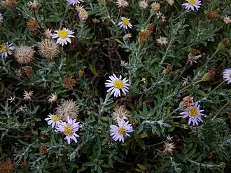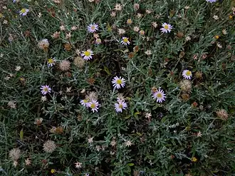 Iit is an erect herb growing up to 35 cm high, with stems that are very woolly and a snowy white.[2] The leaves are 1.1 to 5 mm wide (excluding the marginal teeth). There are abundant glandular hairs on the outer involucral bracts, and the lobes of the disc florets are hairy-glandular.[2]