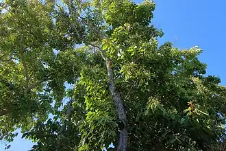 A eudicot,[3] it is a flowering deciduous tree with light gray bark.[4] It can grow to a height of 20 metres (66 ft). Its large, papery leaves are somewhat oval in shape, usually 12 to 28 cm (5 to 10 in) long and 6 to 12 cm (2 to 5 in) wide.[4] The flowers, which bloom from May through July, produce a gray-brown fruit with one seed in September.[4]