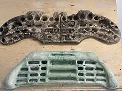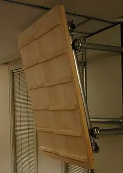 The MoonBoard is a rectangular 2.44-metre (8.0-foot) by 3.25-metre (10.7-foot) section of climbing wall, typically overhanging at 25 or 40 degrees, onto which climbing holds have been fixed in a dense grid-like fashion, with modern MoonBoards having almost 200 individual holds.[7] The tool was first commercially manufactured by British climbers Ben Moon and Rich Simpson in 2005, as a copy of the tools that they and other leading British climbers were using at an informal indoor climbing gym called The School Room in Sheffield, England.[8] Moon created earlier versions from wood in the late 1980s and 1990s, which he built with British climber Andy Pollitt as rudimentary indoor extreme training climbing walls that could fit into the basement of their house in Sheffield.[8]