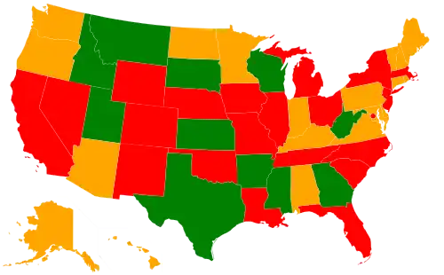 As of 2025, 19 states ban the carrying of a concealed weapon on a college campus; 12 states allow individual colleges and universities to make decisions on whether to prohibit or permit the carrying of a concealed weapon on their campuses; 11 states (either because of state legislation or judicial decision) permit the carrying of concealed weapons on public post-secondary college campuses; and two states (Utah, West Virginia) have a specific state law requiring all public colleges and universities to allow the carrying of concealed weapons on their property.[1][2]