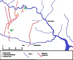 Just inside the earthworks, at Lexden, are located the burial mounds of the rulers of Camulodunon, which contain large amounts of grave goods including imported Roman material from Europe;[5] the largest of these mounds is the Lexden tumulus.[23][24] The Lexden area around the mounds contains several Iron Age cremation burial groups, including one containing the "Mirror burial", with other burials located around the Camulodunon site.[5] A large cluster of cremations from St. Clare road and Fitzwalter Road close to the Lexden Tumulus date to 50–10 BC.[19]