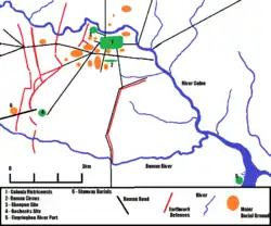 The legionary fortress was larger than a standard castrum, and included a large annex on its north-east side.[5] It was protected by a large palisaded ditch and wall (Roman military Vallum and Fossa), along with new earthwork ditch and rampart defences, built to supplement the existing native defences.[3][37][38] One of these was around the Sheepen site, which became the main Roman port for the fortress and later for the town, with another military river port at Fingringhoe.[5] Archaeological excavations in 2008–2009 revealed that the Roman Sheepen site was more extensive than previously thought, and had a network of gravelled roads and timber-buildings, some of which contained timber-lined basements.[19] A wooden paddle for a coracle was found preserved at the site.[19] The fortress had two main metalled roads, a north–south via principalis and an east–west via praetoria, as well as a via sagularis around the inside of the defensive walls.[38] Along the roads leading out of the fortress settlements known as vici developed, home to native Britons who served the Roman garrison.[5] The interior of the fortress consisted of long barrack blocks able to hold groups of eighty soldiers, known as a Century, with a large room for a centurion at one end of each block.[38] Larger buildings for military Tribunes have been excavated in the centre of the fort[38] The walls of the military buildings were built on mortared plinths called opus caementicium, with wooden and daub walls faced with keyed plaster.[38] Roman military equipment and weapons have been found from the fortress, including swords, armour and harness fittings.[3]
