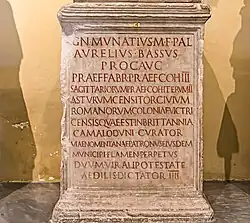- (Translated: Gnaeus Munatius Aurelius Bassus, son of Marcus of the Palatine Tribe, Procurator of the Emperor, Prefect of the Armourers, Prefect of the Third Cohort of Archers, Prefect again of the Second Cohort of Asturians, Census Officer of the Roman Citizens of Colonia Victricensis, which is in Britain at Camulodunum, Overseer of the Nomentum Road, Patron again of the same municipality, Priest for life, Aedile with magisterial power, Dictator four times.)[5]