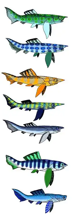 | Reconstructions of the various members of the arthrodire placoderm family Camuropiscidae. From top is Camuropiscis laidlawi, C. concinnus, Fallacosteus turneri, Rolfosteus canningensis, Tubonasus lennardensis, Latocamurus coulthardi, and Simosteus tuberculatus. | |