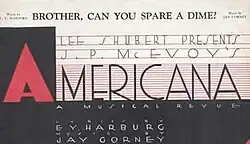 At the time, reviews of musicals rarely devoted much space to the songs' lyrics and melody. That was not true of the reviews of Americana.[17] In The New York Times, Brooks Atkinson wrote that "Brother, Can You Spare a Dime?" was "plaintive and thundering" and "the first song of the year that can be sung ... Mr. Gorney has expressed the spirit of these times with more heart-breaking anguish than any of the prose bards of the day."[17][18] Gilbert Gabriel in New York American wrote: "Gorney and Harburg have written something so stirring that it will run away with the whole show".[17] Theater Arts Monthly's review stated that the song "deflates the rolling bombast of our political nightmare with greater effect than all the rest of Mr. McEvoy's satirical skits put together"; Variety said that "Brother" was the only part of the show worth praising.[17] Harburg later wrote that the song earned him several thousand dollars and helped him get started in the music business.[19] Business leaders tried to have it banned from the radio, viewing the song as "a dangerous attack on the American economic system". They were unsuccessful, due to the song's popularity.[2][12] William Zinsser writes that "[t]he song so lacerated the national conscience that radio stations banned it" for being "sympathetic to the unemployed".[20]