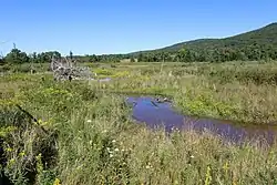 Several habitat types can be found in the wet soils of the forests, shrublands and open spaces in the refuge. White-tailed deer, raccoons, geese, and squirrels are common, and minks, bobcats, black bears, and barred owls can be seen. Beaver dams affect local water levels. Gamebird species include wild turkeys, ruffed grouse, and woodcocks. The area is also an important habitat for many declining North American bird species, including the bobolink, clay-colored sparrow, Henslow's sparrow, northern saw-whet owl, and cerulean warbler. The fish fauna includes native brook trout and introduced species of trout and bass.