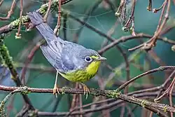 During the breeding season 82% of the population can be found in Canada and 18% in the United States.[7] In Canada, the summer range extends from southeastern Yukon to Nova Scotia. In the United States, the range extends from northern Minnesota to northern Pennsylvania, east to Long Island, New York. It also nests in the high Appalachians as far south as Georgia.[11] In winter, the Canada warbler's range extends from Guyana to northwestern Bolivia around the northern and western side of the Andean crest.[12]