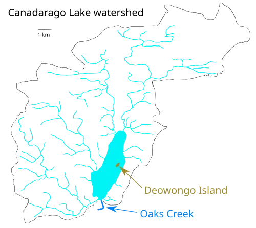 There is a small island near the eastern shore called Deowongo Island.[8] There is a sunken island on Canadarago Lake called Loon Island.[9] This island was less than an acre and stood toward the north end of the lake toward the northwest side, near the Baker's Beach area.[6]