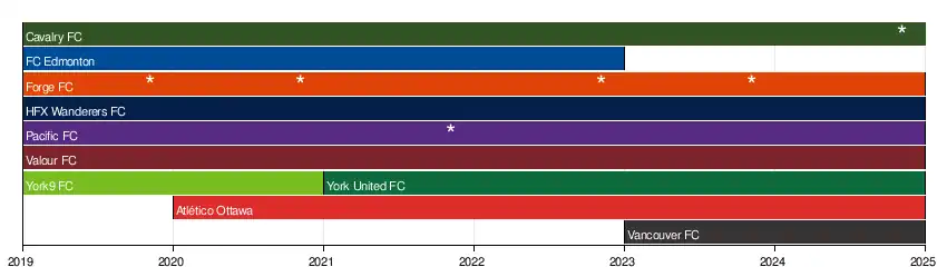 | Forge FC | 4 | 2019, 2020, 2022, 2023 | 2 | 2021, 2024 | 6 |