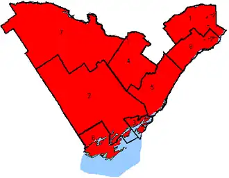 The 2019 election saw the Conservatives regain Hastings—Lennox and Addington, with the other seats remaining unchanged, resulting in the Conservatives winning five seats to the Liberals three.