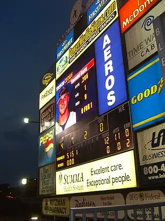 In January 2013, shortly after Ken Babby-led Fast Forward Sports Group acquired the team, the Aeros' announced a $1.65 million project to install a new scoreboard at 26 ft high and 68 ft wide, continuing to be one of the largest in Minor League Baseball. Additionally, a new smaller ribbon board display in left field was installed as well. Both displays were designed and built by Daktronics.[9][10]