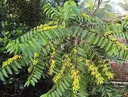 Cananga odorata, known as ylang-ylang (/ˈiːlæŋ ˈiːlæŋ/ EE-lang-EE-lang) or cananga tree, is a tropical tree that is native to the Philippines, Malaysia, Indonesia, New Guinea, the Solomon Islands, and Queensland, Australia. It is also native to parts of Thailand and Vietnam.[1] It is valued for the essential oils extracted from its flowers (also called "ylang-ylang"), which has a strong floral fragrance. Ylang-ylang is one of the most extensively used natural materials in the perfume industry, earning it the name "Queen of Perfumes".[2][3][4]