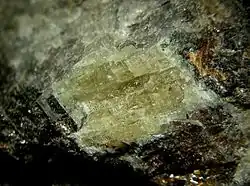 It is a relatively rare mineral. It occurs as aggregates in charoite, creating cabochons when contrasted against swirling purple charoite. It is extremely rare for canasite to be faceted. As crystals, it occurs in a size up to 10 cms, but in platy aggregates it can reach up to 20 cms in size. It is also granular.[3] Twinning is usual, and can occur as polysynthetic, which is when multiple twins align in a parallel.[4] It has a barely detectable 1.12% potassium radioactivity based on the GRapi unit (Gamma Ray American Petroleum Institute Units).[5] It consists of mostly oxygen (41.98%), silicon (26.8%) and calcium (15.93%), but otherwise contains sodium (7.31%), potassium (6.22%), which gives its radioactive properties, fluorine (1.51%) and hydrogen (0.24%).[4] There are two varieties of canasite: fluorcanasite and frankamenite. Purple canasite may be confused with stichtite, but recent research has found that the mineral advertized as canasite is a new specimen.[6]