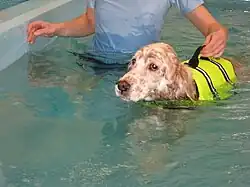 ![]() Hydrotherapy is one of the many physical therapy techniques used at animal physical therapy practices. Above, a veterinary technician assists a dog to swim. | |