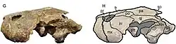 The skull of Caninemys is robust and roughly triangular in shape with thick and massive premaxilla. The eyes are dorsally oriented, facing slightly upward. No nasal bones are present as in other members of Pelomedusoides. Instead the prefrontals make up most of the anterior portion of the skull, including the area just above the nares. The prefrontals extend past the maxilla, giving it a somewhat stub-nosed appearance. The paired prefrontals, frontals and parietals all contact their respective second bone at the midline. The frontals lack the groove that is characteristic for Podocnemis. Scales are preserved on the skull roof, especially over the parietals. Based on this Caninemys had triangular interparietal scales, similar to modern Podocnemis species. The premaxilla are paired, but only make up a small portion of the jaws just below the nares. The triturating (grinding) surface of Caninemys is notably more complex than in modern podocnemidids, with a sharp labial ridge that forms a small but distinct toothlike process at the midline contact of the premaxilla. The premaxilla also form a large recess to accommodate for a hooked lower jaw, as seen in the modern Alligator Snapping Turtle. The maxilla of Caninemys are noticeably enlarged and give the animal a superficially "bulldog-like" appearance. The maxilla also stands out for the large, tooth-like processes formed by the labial ridge and flanking the premaxilla on both sides. These processes, superficially resembling the canine teeth seen in mammals, are very noticeable when the skull is viewed head-on. These two processes, alongside the premaxillary process, account for the tridentate condition that gives Caninemys tridentata its species name. Even without these processes the labial ridge is very pronounced in Caninemys, being thick and extending downward 2 centimeters into a flattened edge. The ridge curves upwards close to the maxilla, creating a u-shaped notch. However, Caninemys does not possess a secondary palate like in Bairdemys, Stereogenys and Shweboemys.[2]