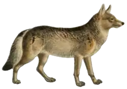 Xenocyon (strange wolf) is an extinct subgenus of Canis.[15] The diversity of the Canis group decreased by the end of the Early Pleistocene to the Middle Pleistocene and was limited in Eurasia to the small wolves of the Canis mosbachensis–Canis variabilis group and the large hypercarnivorous Canis (Xenocyon) lycaonoides.[16] The hypercarnivore Xenocyon gave rise to the modern dhole and the African wild dog.[1]: p149