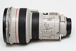 The 200 mm f/1.8 USM lens, introduced in November 1988, is the fastest 200 mm ever produced.[1] It is a large off-white lens with rear drop-in filter tray. Production was discontinued in 2004. It featured an unusual "focus by wire" system where the focus ring drove the motor when focusing in manual mode. This functionality was shared with other lens of this era, the 300mm f/2.8, the 600mm f/4.0 and the 1200 mm f/5.6 USM lens from Canon and these 4 lenses shared the same focus motor. The lens was used in the SuperWASP extrasolar planet search.[2]