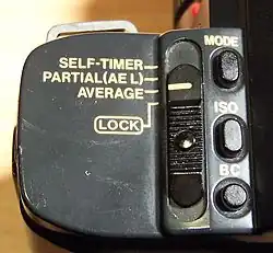 The T70 included two different through-the-lens metering methods; both used a silicon photocell housed above the viewfinder eyepiece. Center-weighted average metering was the standard metering method, averaging over the whole frame with a slight preference towards the center of the frame, where the main subject is most likely to be. With strongly backlit scenes, or ones where the subject is spotlit against a dark background, center-weighted averaging produces underexposure or overexposure, respectively. For such situations, the T70 also supported selective area metering, which metered only the center 11% of the frame. The metering mode was selected by a sliding switch on the top left-hand side of the camera (from the photographer's perspective). This switch also selected self-timer mode and had a Lock position.