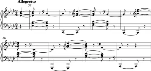 Antony Hopkins describes the above as "a delightfully naïve canon".[14] More sophisticated and varied in its treatment of intervals and harmonic implications is the canonic passage from the second movement of his Piano Sonata 28 in A major, Op. 101: