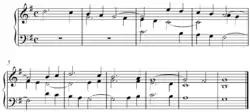 Both J. S. Bach and Handel featured canons in their works. The final variation of Handel's keyboard Chaconne in G major (HWV 442) is a canon in which the player's right hand is imitated at the distance of one beat, creating rhythmic ambiguity within the prevailing triple time: