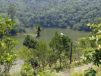 The dam creates the relatively small Canyon Reservoir, measuring at 450 m (1,480 ft) and 350 m (1,150 ft) in its longest length and width, respectively. The reservoir's primary source of water is the Maskeliya Oya, with additional water discharged from the Canyon HPower Station, located at the same site.[1]