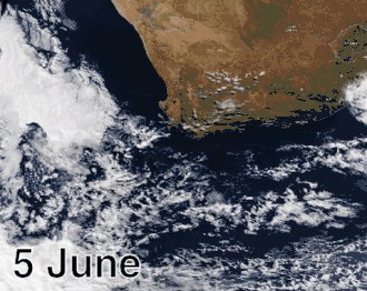 ![]() Satellite imagery showing the storm front as it hit the Western Cape from before the storm hit on 5 June to the day the storm made landfall on the 7th to the day after on 8 June. The small red dots between Knysna and Port Elizabeth represent fires and thermal anomalies that spread in the wake of the storm. | |
